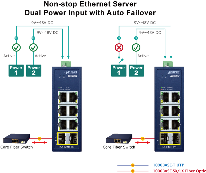 IGS-820TF-PN оснащен мощной системой двойного питания с широким диапазоном напряжений (9 В ~ 48 В постоянного тока или 24 В переменного тока) для повышения надежности системы и времени безотказной работы в сетях автоматизации. Например, при отказе источника питания 1 автоматически активируется функция аппаратного восстановления после сбоя для питания IGS-820TF-PN через источник питания 2, обеспечивая бесперебойную работу.