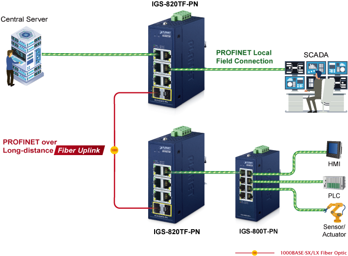 IGS-820TF-PN специально разработан для промышленных сред, где требуется передача данных в режиме реального времени, простое развертывание и стабильная производительность сети. Благодаря системе приоритезации трафика PROFINET, двум гигабитным SFP-каналам связи и компактному прочному дизайну он идеально подходит для использования в системах автоматизации производства: