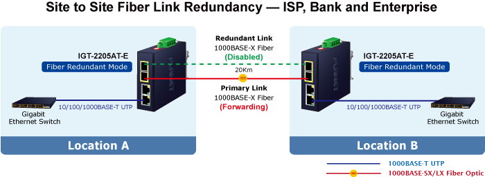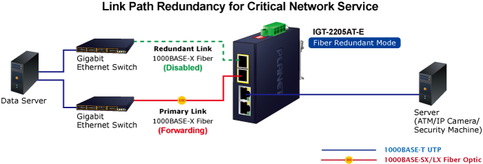 С помощью встроенного DIP-переключателя два оптоволоконных интерфейса SFP IGT-2205AT-E могут быть сконфигурированы как режим коммутации Ethernet или режим оптоволоконного резервирования. В режиме коммутатора Ethernet он может работать в режиме хранения и переадресации с высокой производительностью; в режиме 2-портового оптоволоконного резервирования он обеспечивает быстрое оптоволоконное резервирование линии связи для особо важных приложений Ethernet. Режим резервирования поддерживает функцию автоматического восстановления. Если порт назначения пакета отключен, он переадресует пакет на другой порт резервной пары.