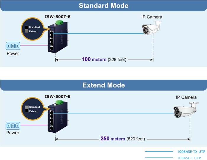 The built-in solid DIP switch provides "Standard" and "Extend" operation modes. The ISW-500T-E operates as a regular Ethernet switch in the "Standard" mode. In the "Extend" operation mode, the ISW-500T-E operates on a per-port basis in 10Mbps duplex mode, supporting data transmission over a distance of up to 250 meters, overcoming the typical 100-meter limitation of Ethernet UTP cable. This feature offers a cost-effective solution for extending Ethernet transmission distance without additional equipment.