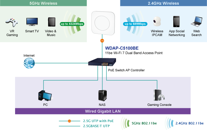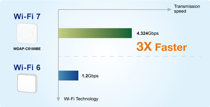 WDAP-C5100BE оптимизирован для корпоративных сред и ориентирован на стабильность, эффективность и высокую производительность сети. Она обеспечивает скорость до 4,324 Гбит/ с в диапазоне 5 ГГц, что в три раза повышает производительность по сравнению с Wi-Fi 6E и обеспечивает стабильное и непрерывное подключение.