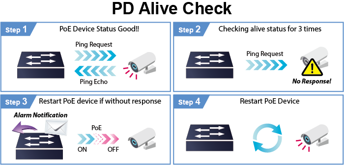 WGS-5215-16UP4X можно настроить на мониторинг состояния подключенных PD-устройств в режиме реального времени с помощью функции проверки связи. Если PD-устройство перестает работать и отвечать на запросы, WGS-5215-16UP4X возобновит подачу питания на порт PoE и вернет PD-устройство в рабочее состояние. Это значительно повысит надежность сети за счет сброса питания PD-устройства через порт PoE и снизит нагрузку на администратора.