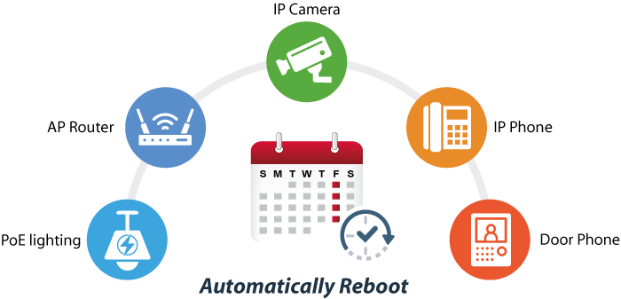 Коммутатор Planet WGS-5215-16UP4X позволяет перезагружать каждую из подключенных IP-камер с поддержкой PoE или беспроводных точек доступа с поддержкой PoE в определенное время каждую неделю. Это снижает вероятность сбоя IP-камеры или точки доступа из-за переполнения буфера.