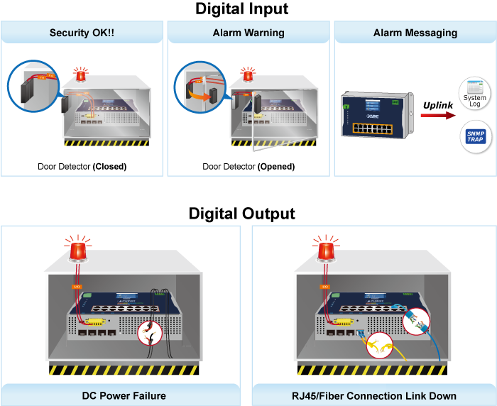WGS-5215-16UP4X оснащен цифровым входом и цифровым выходом на верхней панели. С помощью цифрового входа можно обнаруживать и регистрировать состояние внешних устройств (например, датчиков открытия дверей), а также отправлять администраторам оповещения о событиях. Цифровой выход можно использовать для оповещения администраторов в случае обрыва связи, восстановления связи или отключения питания.
