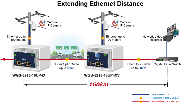В режиме «Расширение» коммутатор WGS-5215-16UP4X, использующий входное напряжение 54 В постоянного тока, работает на уровне портов в режиме дуплексной передачи данных со скоростью 10 Мбит/с, но при этом может выдавать мощность PoE до 53 Вт на расстояние до 250 метров, преодолевая ограничение в 100 метров для кабеля Ethernet UTP. Благодаря этой новой функции коммутатор WGS-5215-16UP4X представляет собой дополнительное решение для увеличения дальности передачи питания по стандарту 802.3at/af PoE, что позволяет сократить расходы на прокладку Ethernet-кабелей.