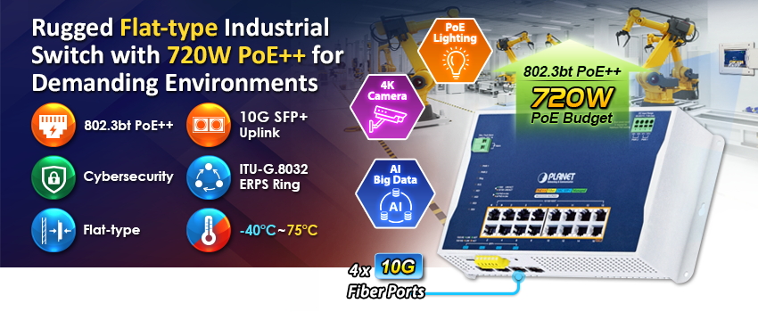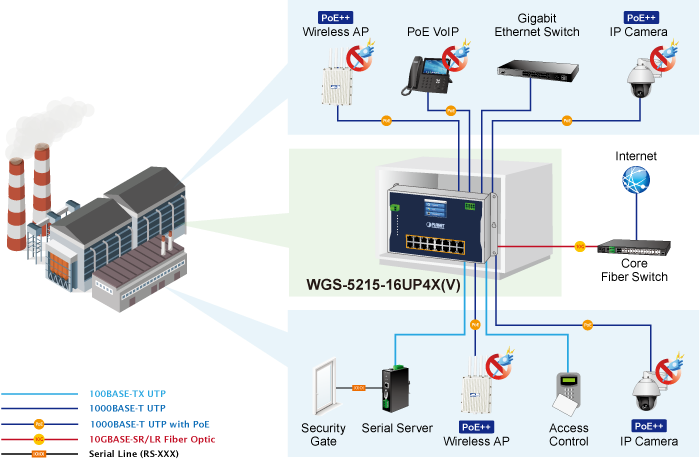 WGS-5215-16UP4X оснащен 16 встроенными портами питания PoE++ с выходной мощностью до 95 Вт на каждый порт и может централизованно управлять энергоснабжением промышленной сетевой системы, в которую входят IP-телефоны, IP-камеры, беспроводные точки доступа и многое другое. Например, в промышленной среде можно легко установить 16 IP-камер с поддержкой PoE или беспроводных точек доступа для видеонаблюдения или беспроводной сети с роумингом. Благодаря отсутствию ограничений по количеству розеток WGS-5215-16UP4X упрощает и повышает эффективность установки IP-камер и беспроводных точек доступа.