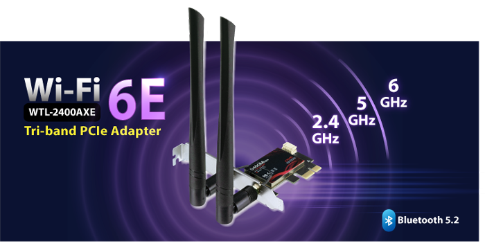 | Package Contents | 1 × WTL-2400AXE Wi-Fi 6E PCIe x1 adapter (full-height bracket pre-installed) 1 × Low-profile bracket 2 × External antennas 1 × Bluetooth® USB header cable (9-pin) 1 × QR code sheet |