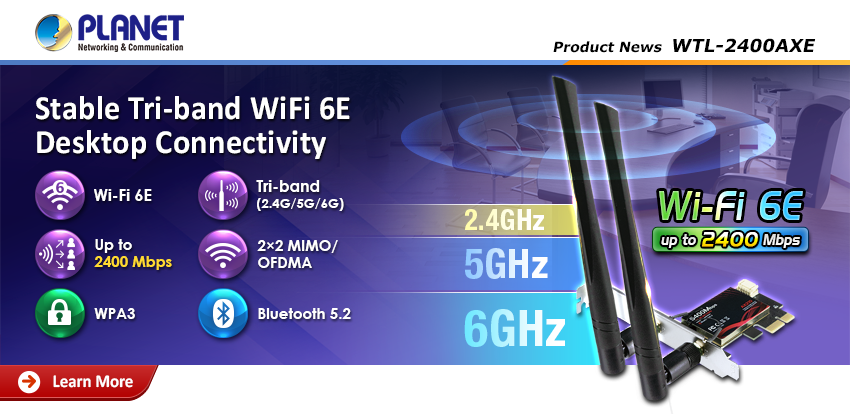 PLANET WTL-2400AXE, построенный на платформе Intel® AX210 2×2 Wi-Fi 6E, обеспечивает трехдиапазонное подключение с частотой 2,4, 5 и 6 ГГц для настольных компьютеров бизнеса и IPC. Благодаря каналам 160 МГц, OFDMA/MU-MIMO, BSS Coloring и WPA3-SAE, он идеально подходит для организаций, стандартизирующих Wi-Fi 6/6E в офисах, аудиториях и конференц—залах. Чистый диапазон 6 ГГц позволяет снизить помехи в совместном канале и обеспечивает постоянную эффективность и меньшую задержку. о существующей инфраструктуре.